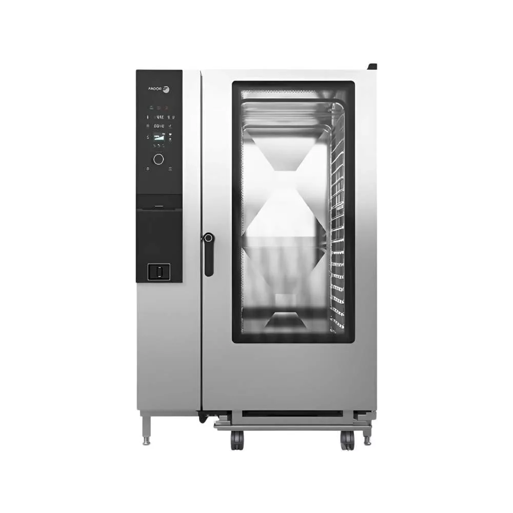 Nagykonyhai használatra tervezett gázüzemű, iKORE sütő, elektromechanikus vezérléssel, DirectSteam, intelligens mosással, 20 db GN 2/1 tálcaférőhellyel, regál kocsival.