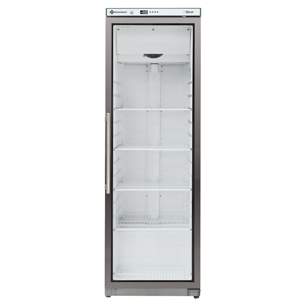Rozsdamentes acél burkolatú ipari fagyasztószekrény, 400 literes űrtartalommal (nettó 300 liter), ventilációs, üvegajtóval.
