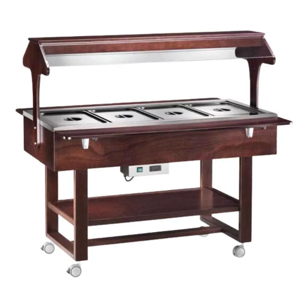 Ez a vízfürdős melegentartó kocsi kifejezetten professzionális vendéglátóhelyek, buffet-szolgáltatók és rendezvényszervezők igényeire készült. A vízfürdős rendszer egyenletes, kíméletes hőátadást biztosít, így az ételek megtartják állagukat és ízüket hosszabb távon is — különösen alkalmas szaftos, krémes vagy érzékeny textúrájú fogások melegen tartására.