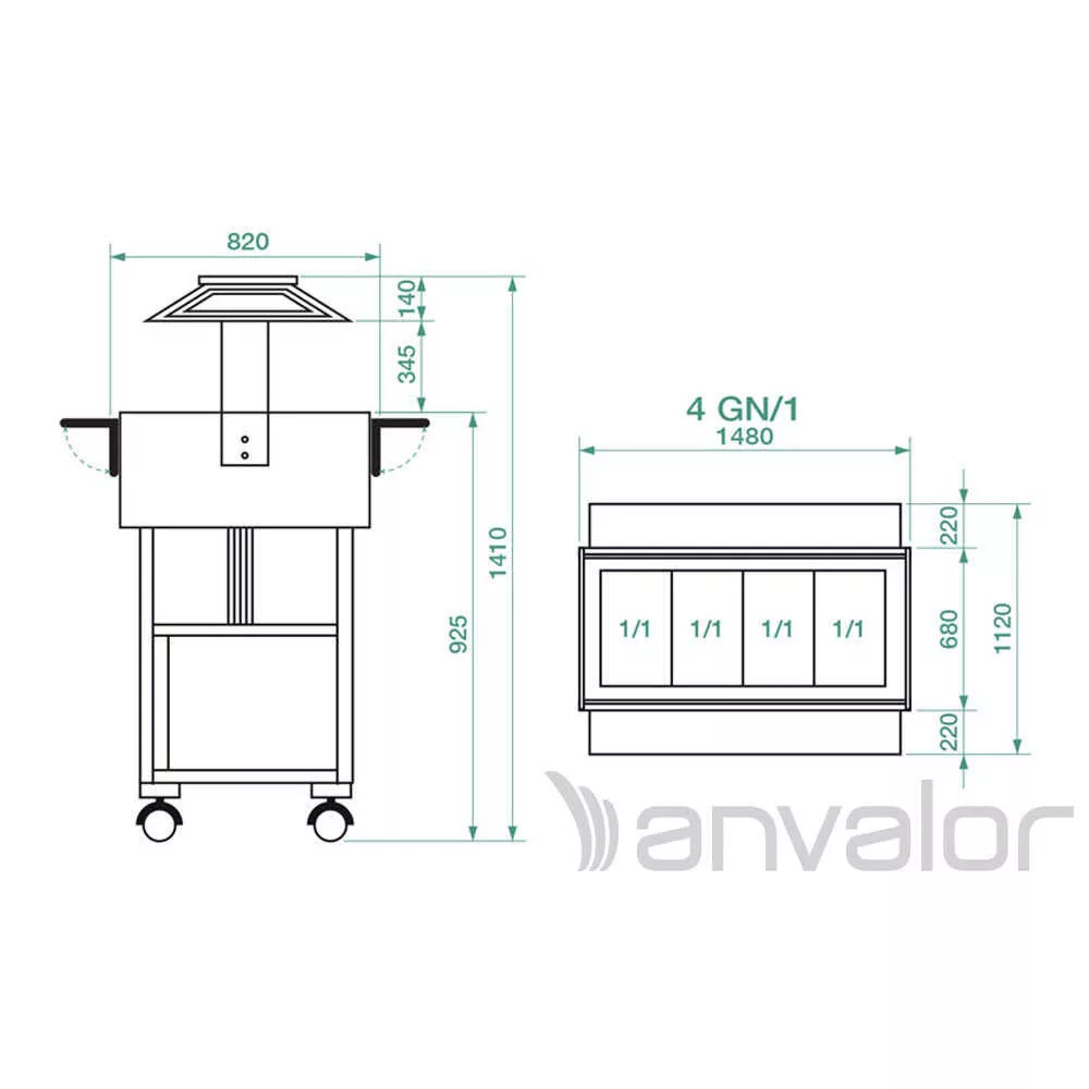 - Lehajtható polcok a hosszanti oldalakon — gyors kiegészítő tálalófelület, amely segít az adagolás és a tálalás szervezésében.