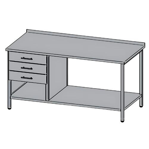 Rozsdamentes (1.4301 CrNi 18/10) munkaasztal hátsó felhajtással, egymás alatt elhelyezett 3 db fiókkal, bal vagy jobb oldalon, alsó polccal. A 30 x 30 mm-es lábak szintezhetőek.