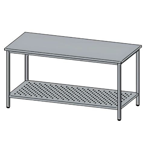 Rozsdamentes (1.4301 CrNi 18/10) munkaasztal perforált alsó polccal, felhajtás nélkül, nyitott. A 30 x 30 mm-es lábak szintezhetőek.
