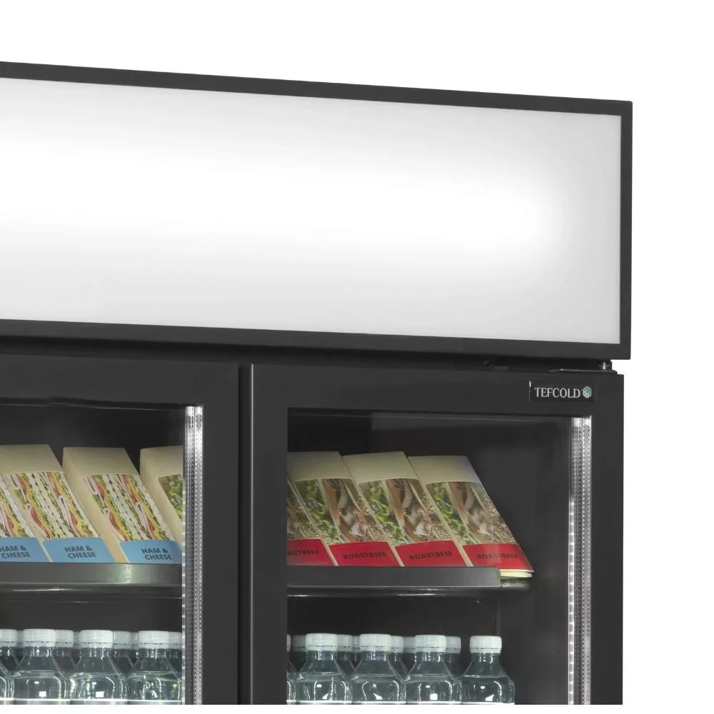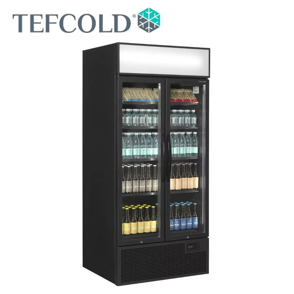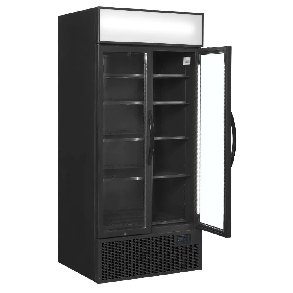 2 ajtós hűtővitrin, fekete külsővel és belsővel, világító hírdető panellel, függőleges belső világítással, állítható polcokkal, állítható lábakkal, önzáró alumínium keretes üvegajtókkal, ventilációs hűtéssel. Csábító kidolgozás, a tartalmat tökéletesen megvilágító, az ajtókereten belüli 2 db függőleges teljes hosszúságú LED lámpával. Ideális csúcskategóriás kávézókhoz, csemegeüzletekhez és cukrászdákhoz.