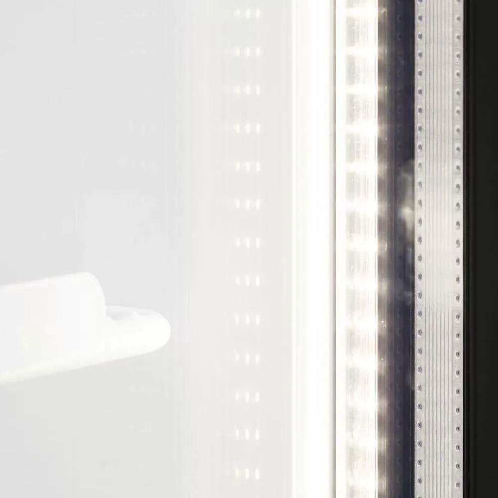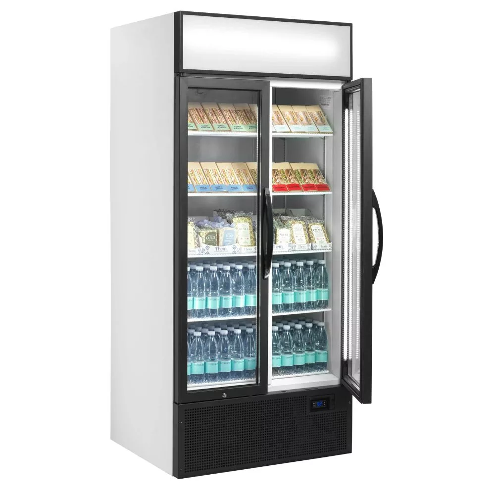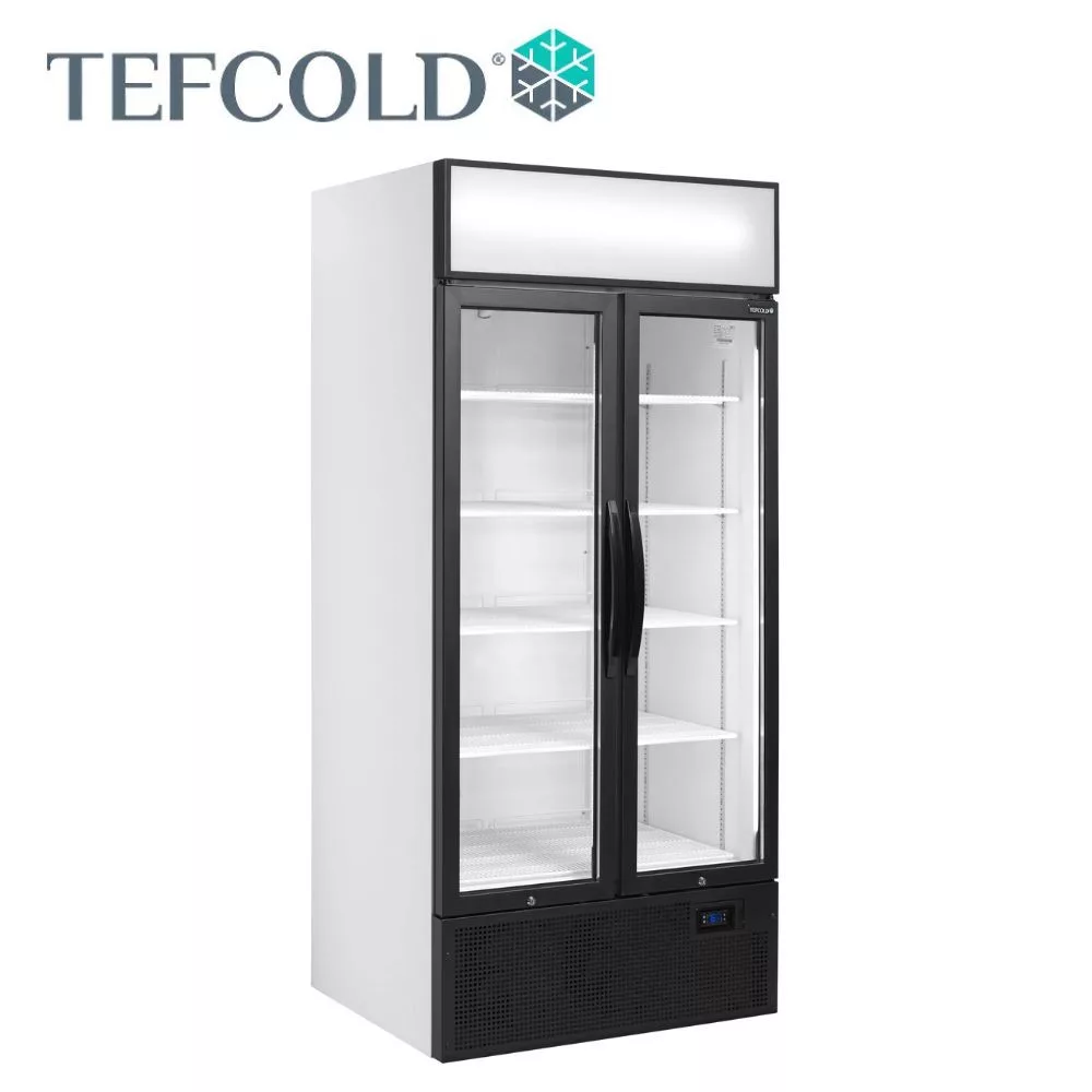2 ajtós hűtővitrin, fehér külsővel és belsővel, világító hírdető panellel, függőleges belső világítással, állítható polcokkal, állítható lábakkal, önzáró alumínium keretes üvegajtókkal, ventilációs hűtéssel. Csábító kidolgozás, a tartalmat tökéletesen megvilágító, az ajtókereten belüli 2 db függőleges teljes hosszúságú LED lámpával. Ideális csúcskategóriás kávézókhoz, csemegeüzletekhez és cukrászdákhoz.