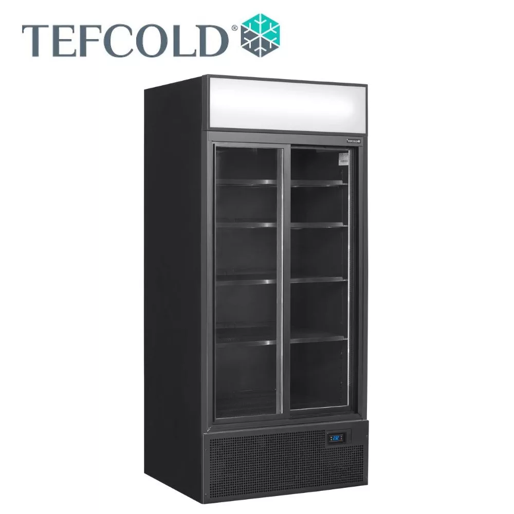 2 ajtós hűtővitrin, fekete külsővel és belsővel, világító hírdető panellel, függőleges belső világítással, állítható polcokkal, állítható lábakkal, önzáró üveg tolóajtókkal, ventilációs hűtéssel. Csábító kidolgozás, a tartalmat tökéletesen megvilágító, az ajtókereten belüli 2 db függőleges teljes hosszúságú LED lámpával. Ideális csúcskategóriás kávézókhoz, csemegeüzletekhez és cukrászdákhoz.
