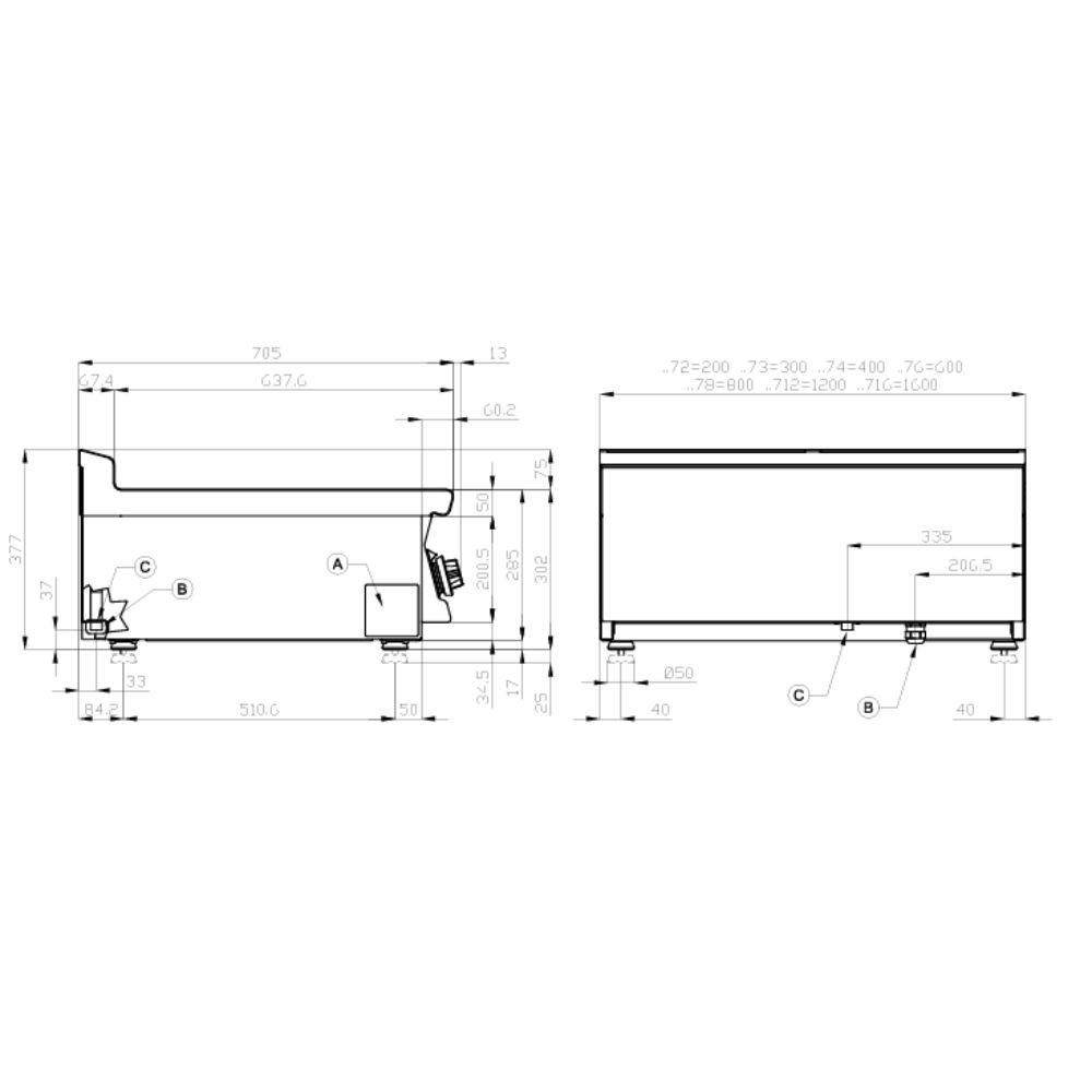 Olaszországban gyártott, nagykonyhai használatra tervezett 2 zónás, 1/2 bordázott + 1/2 sima felületű, asztali, gázüzemű rostlap, lapsütő, szeletsütő rozsdamentes acélból, 2 mm vastag munkalappal, IPX5 védelemmel.