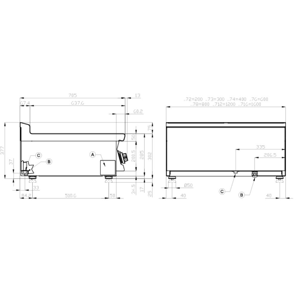 Olaszországban gyártott, nagykonyhai használatra tervezett 2 zónás, 1/2 bordázott + 1/2 sima felületű, asztali, gázüzemű rostlap, lapsütő, szeletsütő rozsdamentes acélból, 2 mm vastag munkalappal, IPX5 védelemmel.