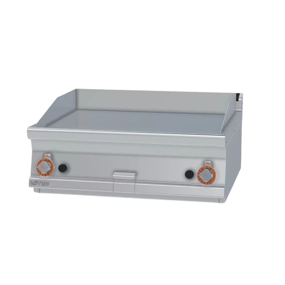 Olaszországban gyártott, nagykonyhai használatra tervezett 2 zónás, sima felületű, asztali, gázüzemű rostlap, lapsütő, szeletsütő rozsdamentes acélból, 2 mm vastag munkalappal, IPX5 védelemmel.