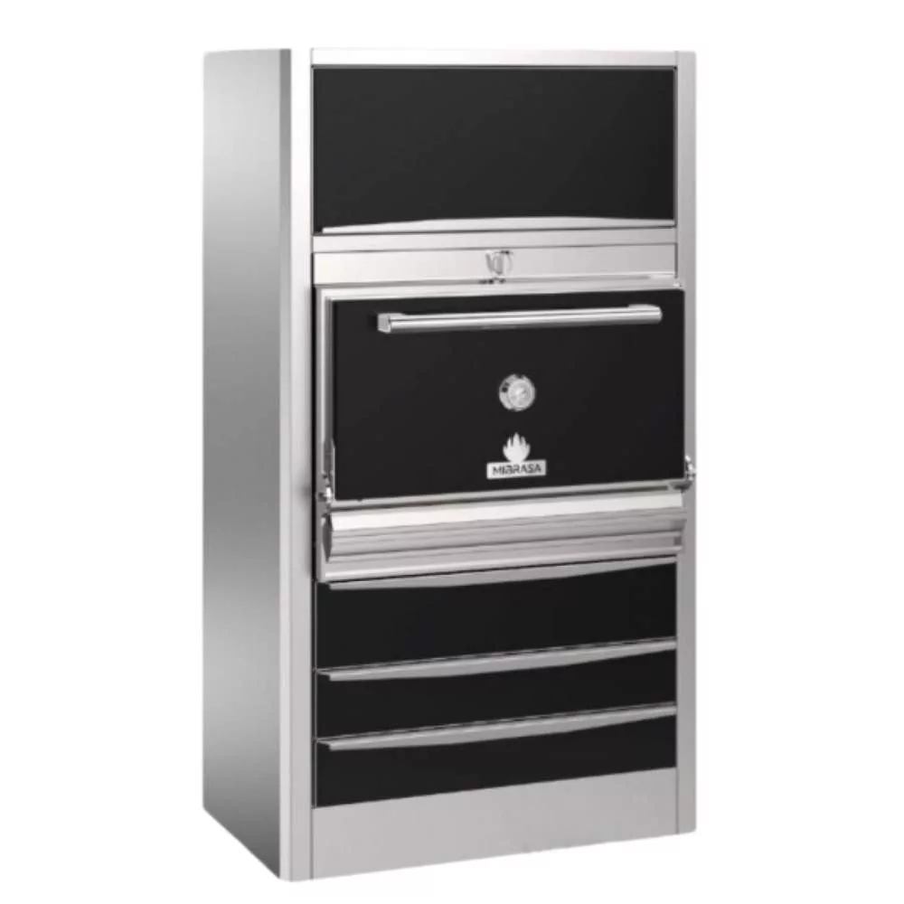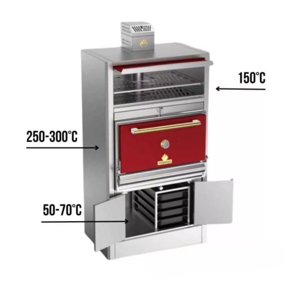 Mibrasa állványos, faszenes sütő, zárt grill. Melegentartó polccal és alsó három fiókos tárolóval, légáramlás szabályzóval. Az alsó fűtött fiókok hőmérséklete egyre alacsonyabb, így egyszerre akár konfitálhatunk, párolhatunk, dehidratálhatunk. Az alsó fiókok hőmérséklete: 90ºC - 65ºC - 55ºC. A felső melegentartó rács hőmérséklete 40-60°C között van, optimalizálva a sütő maradékhőjét. Több színben elérhető, így minden konyhához megtalálható a tökéletes stílus.