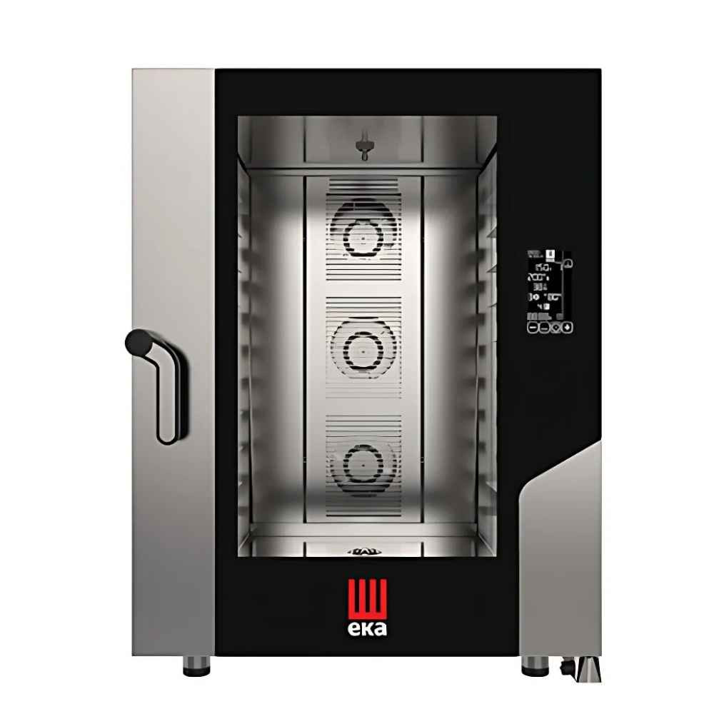 A TECNOEKA MKF 1064 BM egy professzionális elektromos légkeveréses sütő, melyet közepes méretű pékségek és cukrászdák számára terveztek. Ez a készülék lehetővé teszi akár 10 darab 600 x 400 mm-es tepsi egyidejű használatát, biztosítva a nagy mennyiségű termék hatékony sütését.