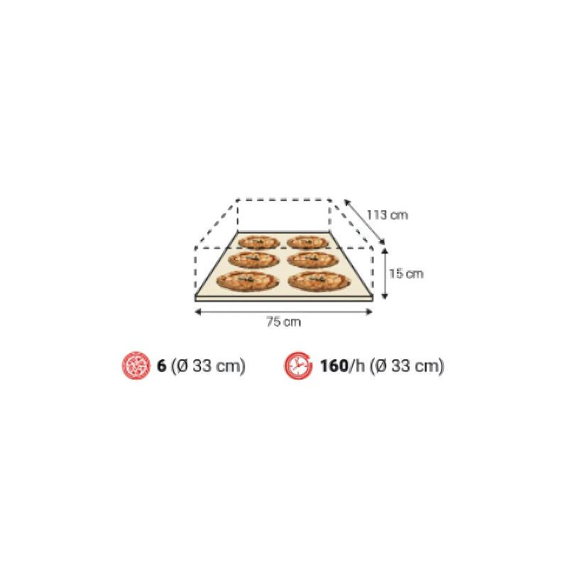 - 6 cm vastag, szabadalmaztatott sütőlap, cserélhető „Biscuit” sütőfelülettel (nem mázas, porózus sütőlap, amely felszívja a tészta nedvességtartalmát, így az alja ropogósabb lesz), amely egy lyuggatott tűzálló fűtőlapra van helyezve