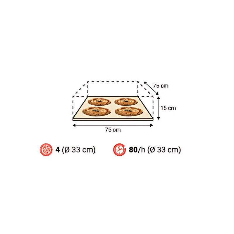 • 6 cm vastag, szabadalmaztatott sütőlap, cserélhető „Biscuit” sütőfelülettel (nem mázas, porózus sütőlap, amely felszívja a tészta nedvességtartalmát, így az alja ropogósabb lesz), amely egy lyuggatott tűzálló fűtőlapra van helyezve