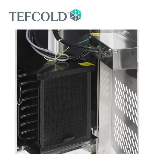 4 ajtós hűtött munkaasztal felhajtás nélkül, kívül-belül rozsdamentes acél kivitelben, ventilációs hűtéssel, önzáródó ajtókkal, automatikus leolvasztással.