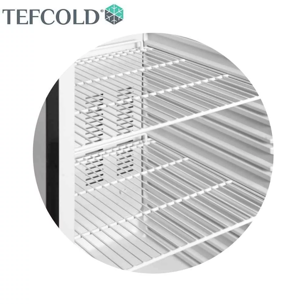 Az eszköz négy, méretre optimalizált fehér rácspolccal rendelkezik (490 x 380 mm), amelyek állítható magasságúak, így könnyen testre szabhatja a polcszinteket a termékek méretéhez és a vizuális elrendezéshez. A rácspolcok kialakítása elősegíti a légáramlást, így nem zárják el a ventiláció útját, és hozzájárulnak az egyenletes hűtéshez.